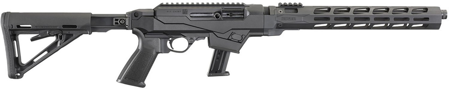 The Ruger PC Carbine 9mm Luger Semiautomatic Rifle features semiautomatic action and a 17-round capacity. It has an aluminum receiver, a threaded muzzle and an adjustable Magpul stock.