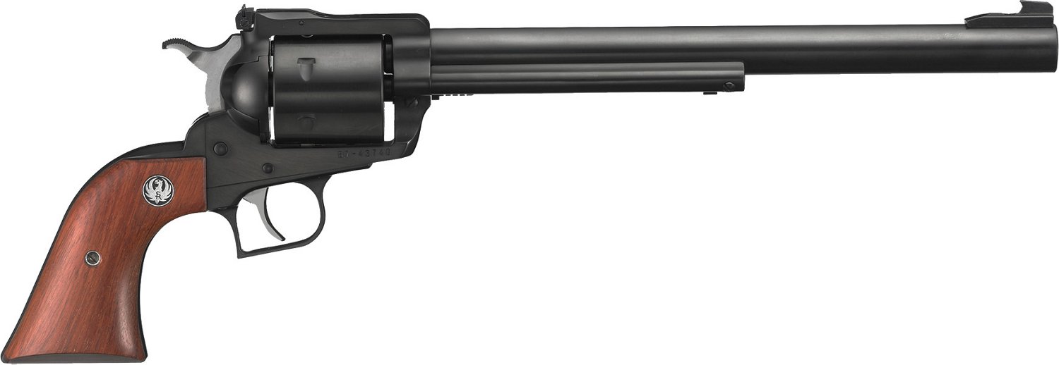 Big game hunters are drawn to the Ruger Super Blackhawk Standard .44 Remington Magnum Revolver for its 6-shot capacity and 10.5-inch barrel. It boasts a Western-style hardwood grip in contrast to the blued metal finish. Ramp front and adjustable rear sights. Transfer bar and loading gate interlock safeties.
