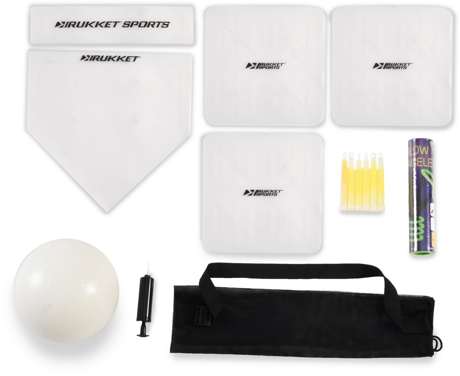 Includes 3 bases, 1 home plate, 1 pitcher's mound, 1 ball and glow sticks