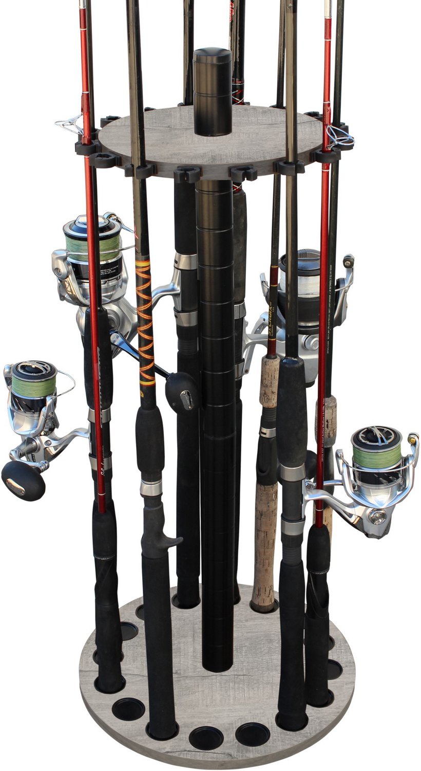 Keep your freshwater rod and reel combos neat and organized with the Rush Creek Barn Wood 16-Rod Floor Storage Rack. The durable rack features 16 flexible, soft rod clips that can adjust to most tapers and sturdy base plate caps to collect water. The laminate wood design adds a sleek, clean-cut appearance to the look.