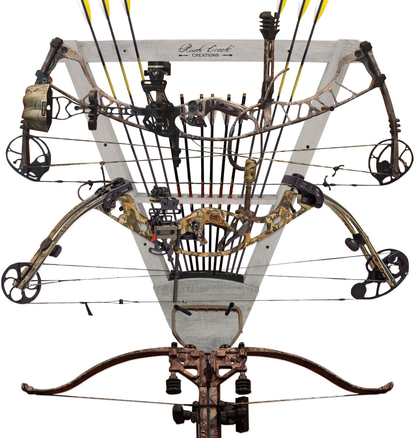 Decorate your hunting cabin and keep your gear organized with the Rush Creek Barn Wood Bow and Arrow Wall Storage Rack. This arrowhead-shaped rack can be configured to hold compound bows, recurve bows, quivers and a crossbow. It can also hold up to 12 arrows of various lengths. Simply adjust the pegs to get the setup you need for your gear. The natural Barn Wood finish completes the look.