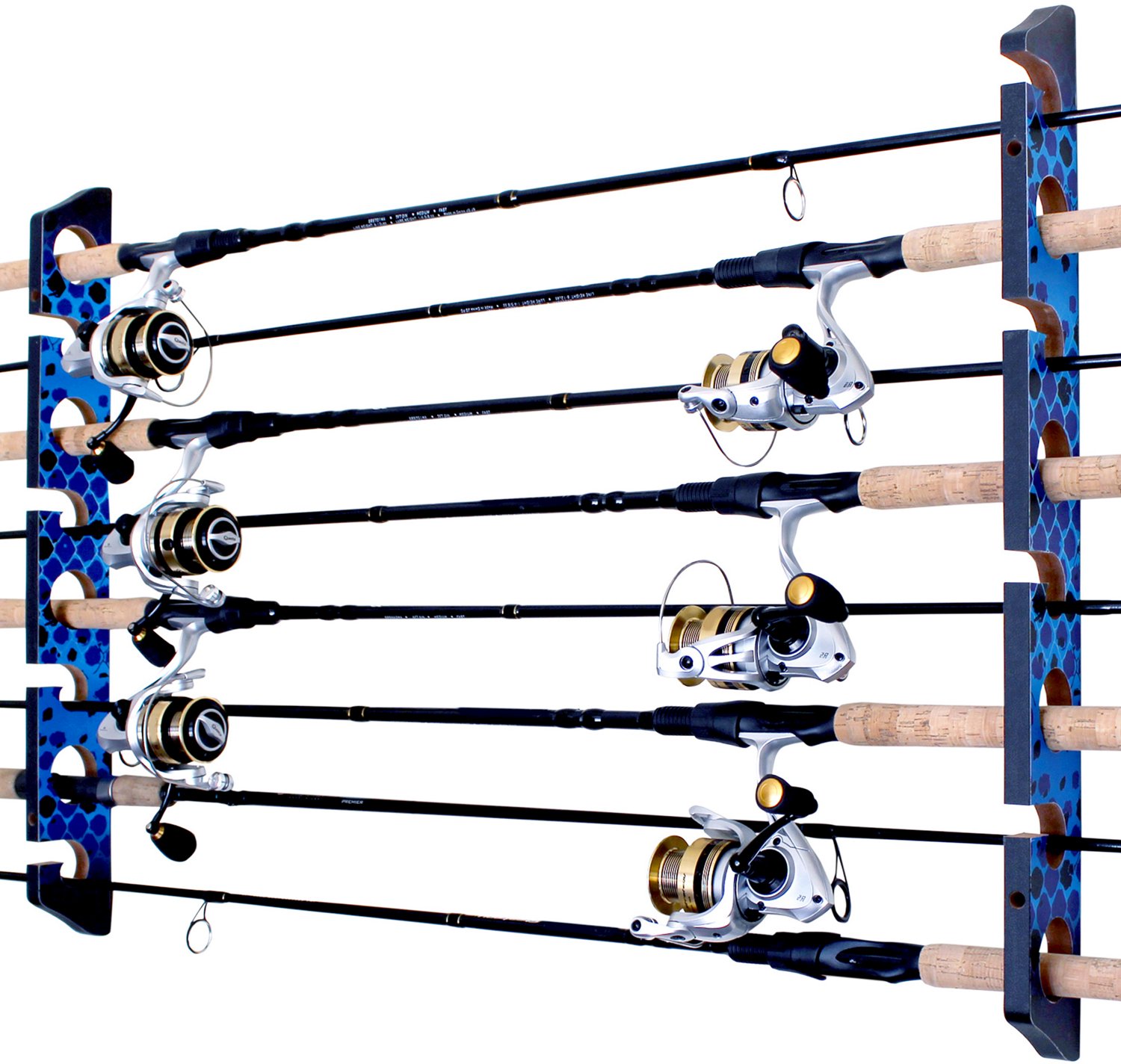 Keep your fishing gear organized with the Rush Creek Wall Ceiling 8-Rod Storage Rack. This 2-piece rack can be mounted on the wall or ceiling for versatile placement, and the deep grooved rod rests securely hold up to 8 rod and reel combos.