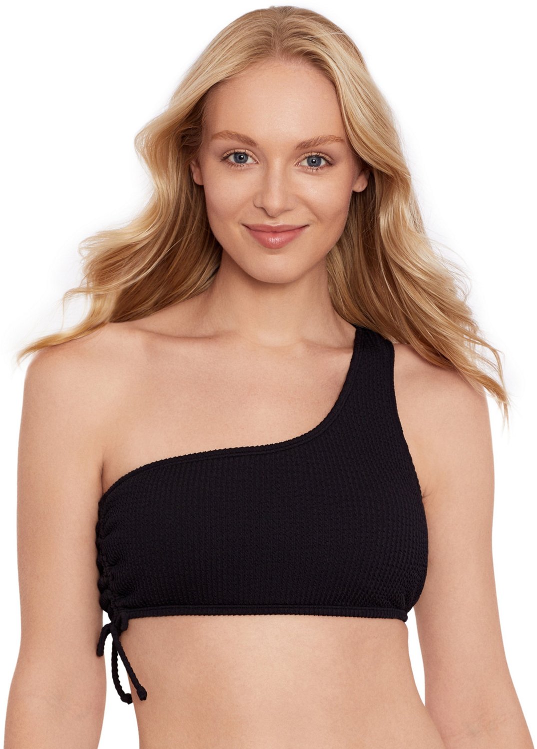 Find you new swimsuit with the Salt + Cove Juniors' Solid 1-Shoulder Swim Top with Tie. This contemporary swim top is made of lightweight polyester and spandex. The 1 shoulder strap creates a modern asymmetrical neckline, and removable cups provide support. The adjustable side shirring helps ensure a comfortable, all-day fit.