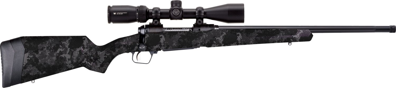 The Savage 110 Apex Hunter XP 6.5 Creedmoor Rifle has a bolt action with a 4-round capacity, and a button-rifled precision barrel. It also has a user-adjustable vertical grip and a synthetic stock.