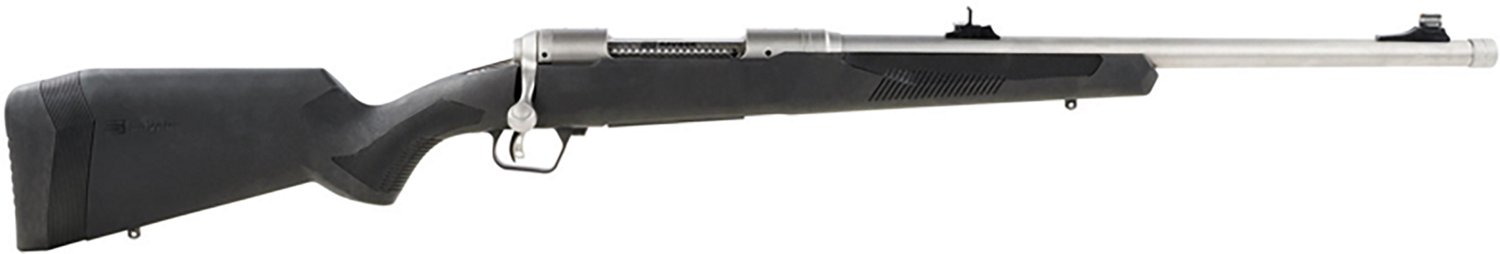 The Savage Arms 110 Brush Hunter 338 Win Rifle has a 20-inch stainless steel barrel with a threaded end cap and adjustable iron sights. It also has a detachable box magazine, adjustable iron sights and a 4-round capacity.