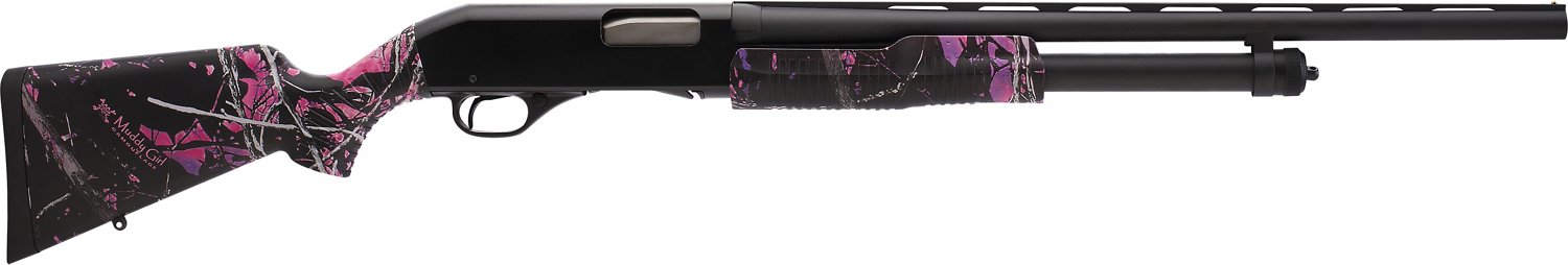 This Savage Arms 320 Field Grade Muddy Girl 20 Gauge Pump-Action Shotgun is outfitted with a 26-inch barrel with a blued finish. The synthetic stock features Muddy Girl camouflage.