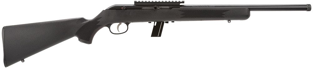 This Savage Arms 64 FV-SR .22 LR Semiautomatic Rifle is outfitted with a 16.5-inch carbon-steel barrel and features a threaded muzzle. The stock is made of synthetic material.