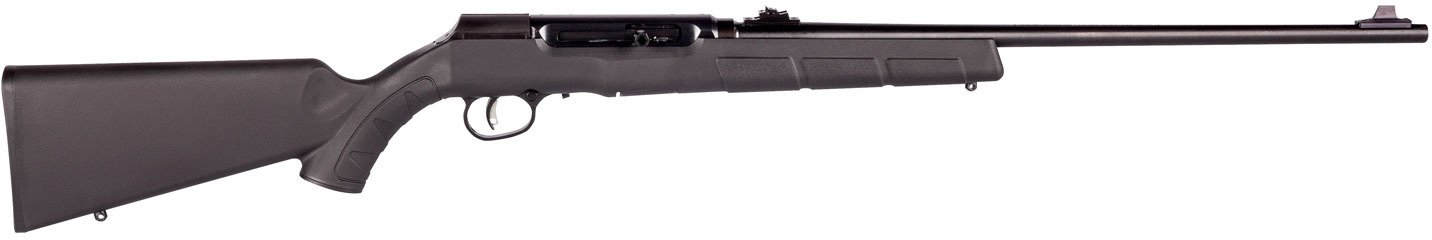 The Savage Arms A22 .22 LR Semiautomatic Rifle features a blued barrel, an oversize bolt handle and a synthetic stock. Designed with an adjustable AccuTrigger, this rimfire rifle has a rotary magazine.