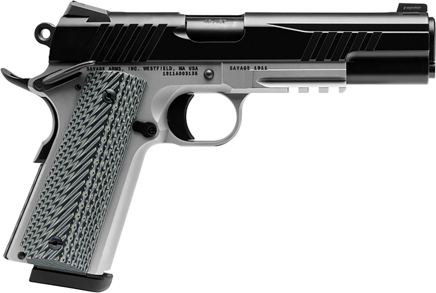 Arm yourself with the Savage Arms Savage 1911 .45 ACP Pistol. It is single action with an 8-round capacity. The barrel with a matte black finish is 5-inches long, and it is equipped with Novak Lo-Mount tritium night sights. The ambidextrous thumb safety finishes off the design.