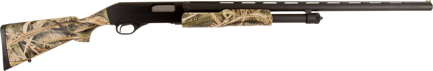 With a Mossy Oak Shadow Grass® Blades® camo print, the Savage Arms Stevens 320 Field Pump-Action 12 Gauge Shotgun makes concealment a priority. Its vent-rib, carbon-steel barrel measures 28 inches long. Plus, it comes with fiber-optic sights. A modified choke tube is included. Standard trigger. Crossbolt safety.