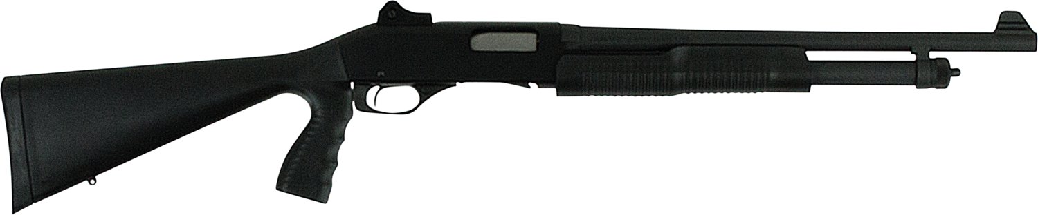 Prepped for home defense, the Savage Arms Stevens 320 Security Pump-Action 20 Gauge Shotgun features a bottom-load receiver, dual slide bars and a synthetic pistol-grip stock. Plus, its 18.5-inch blued barrel comes equipped with ghost ring sights. Cylinder choke tube also included. Manual safety. Standard trigger.