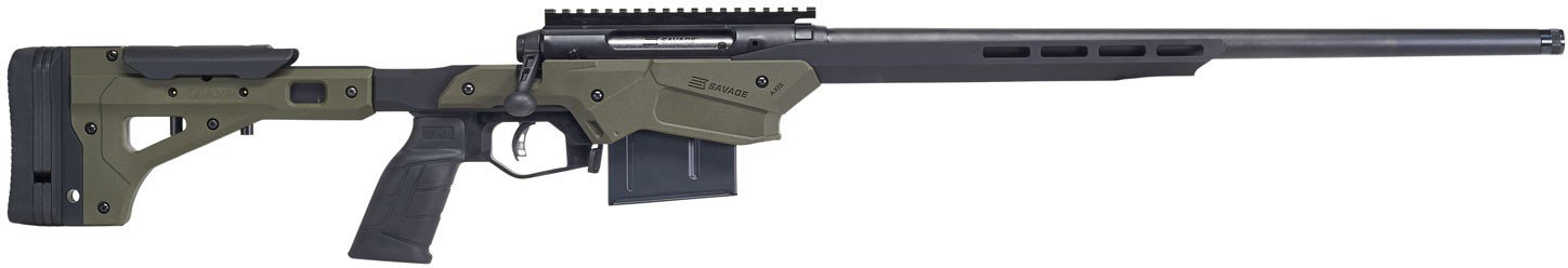 The Savage Axis II Precision .270 Winchester OD Adjustable Bolt-Action Rifle features a carbon steel heavy threaded barrel with MLOK fore-end. Its aluminum stock is fully adjustable and equipped with a user-adjustable AccuTrigger and a detachable AICS magazine.