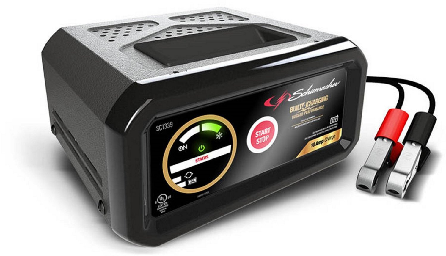 Power your devices with ease on the go with the Schumacher Electric SC1339 10A 12V Trilingual Charger. This device is ideal for most basic charging applications. The start and stop push button interface offers easy operation and the LED indicators provide accurate readouts of device functions. The microprocessor automatically adjusts the amperage rate to charge and maintain, while the multistage charging provides precision, safety and efficient battery life.