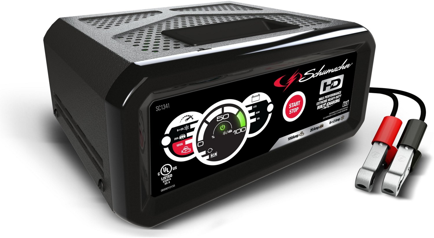 Keep your vehicle ready to go with the Schumacher Electric SC1341 100A 12V Battery Charger. This device provides up to 100 amps of engine starting power for cars, SUVs and small trucks. The start and stop push button interface offers easy operation and the LED indicators supply accurate readouts of device functions. The microprocessor automatically adjusts the amperage rate to charge and maintain, while the multistage charging helps ensure precision, safety and efficient battery life.