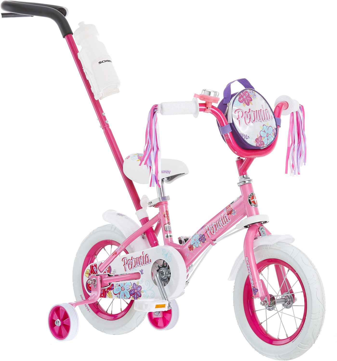Teach her how to ride with the Schwinn Girls' Petunia 12 in Bicycle. Wide street tires allow for comfortable riding, while the removable training wheels and push handle offer support. The enclosed chain guard promotes safety, and the adjustable alloy saddle seat grows with your child.