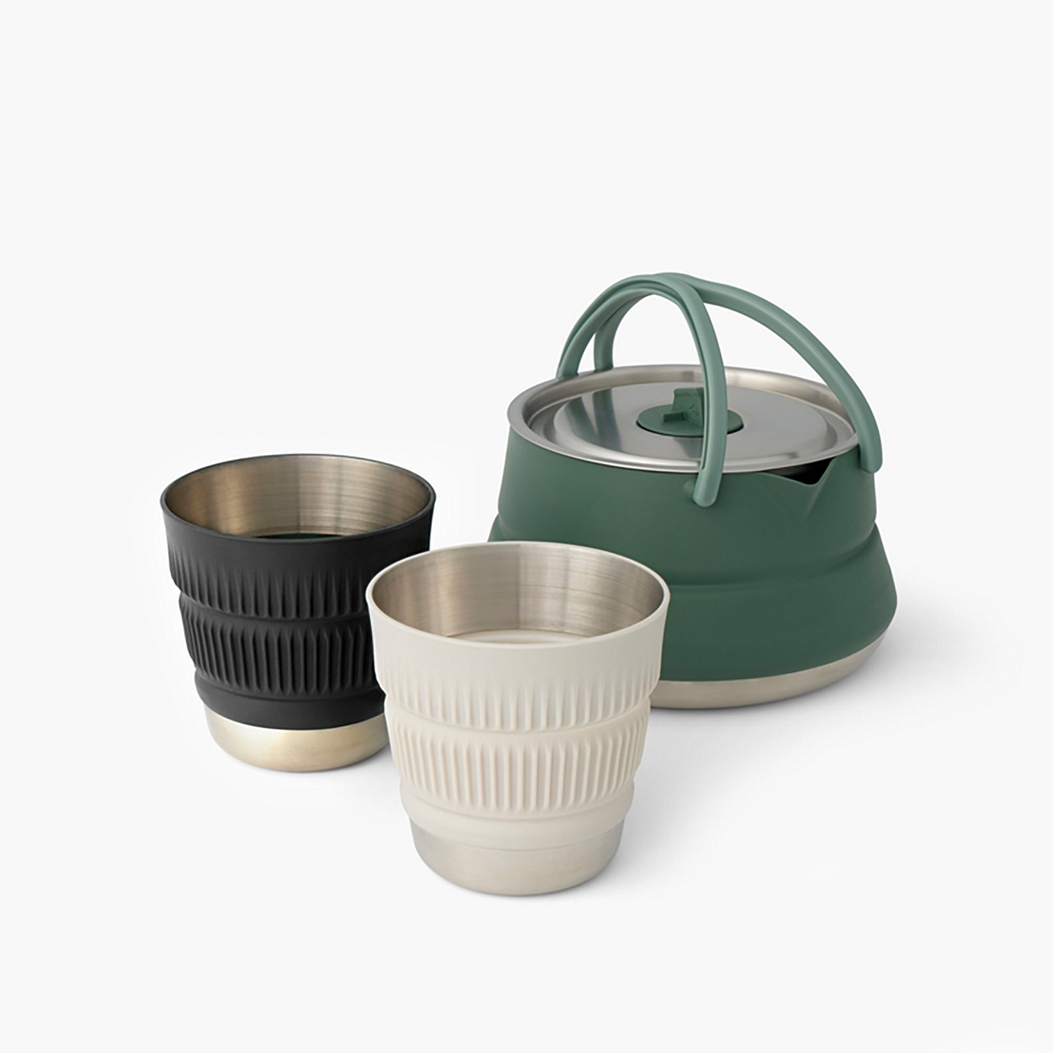 Enjoy a warm beverage outdoors with the Sea to Summit Detour Stainless Steel 3 Piece Kettle Cook Set. The double glass-reinforced nylon kettle handles are a safety feature for carrying hot liquid, and LidKeep technology creates a firm seal between the kettle's lid and rim. Cool Grip silicone inside the set's mugs enables peace of mind when drinking products like coffee or tea, and the kettle can serve as a cookpot if you desire.