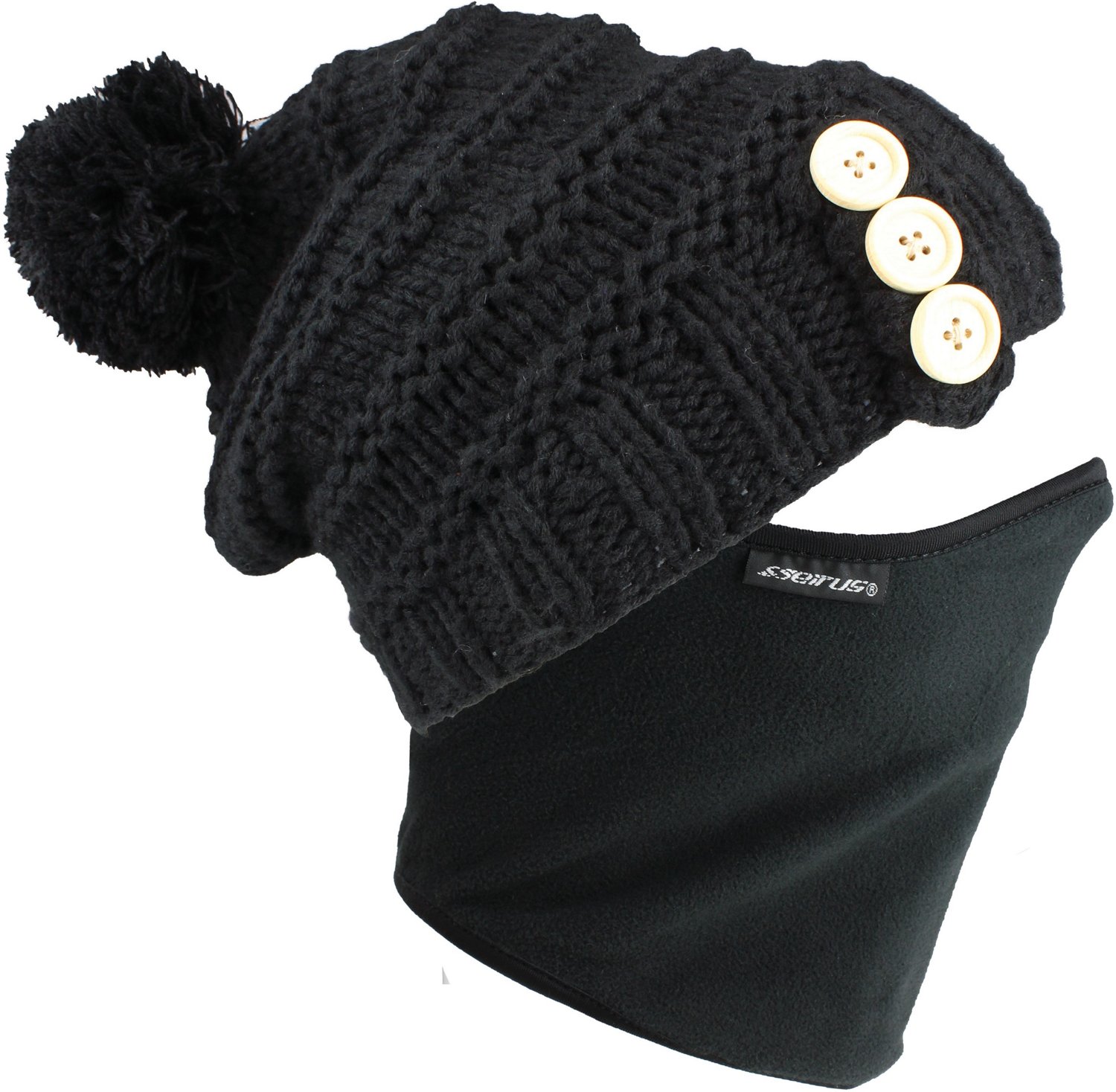 Whether around town or on the slopes, stay warm with a Seirus Quick Clava Solace Hat. Plush acrylic yarn and a fleece lining deliver a soft feel, while the balaclava wrap offers added protection around your face. Decorative buttons and a pom pom elevate your look.