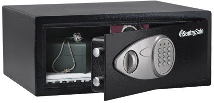 Keep firearms, your laptop and other valuables secure with this SentrySafe Digital Security Safe. Made from solid steel, this safe features a programmable digital lock, 2 live-locking bolts and concealed hinges for theft protection. The power cord access point allows you to keep electronics plugged in while inside the safe. Includes bolt-down hardware.