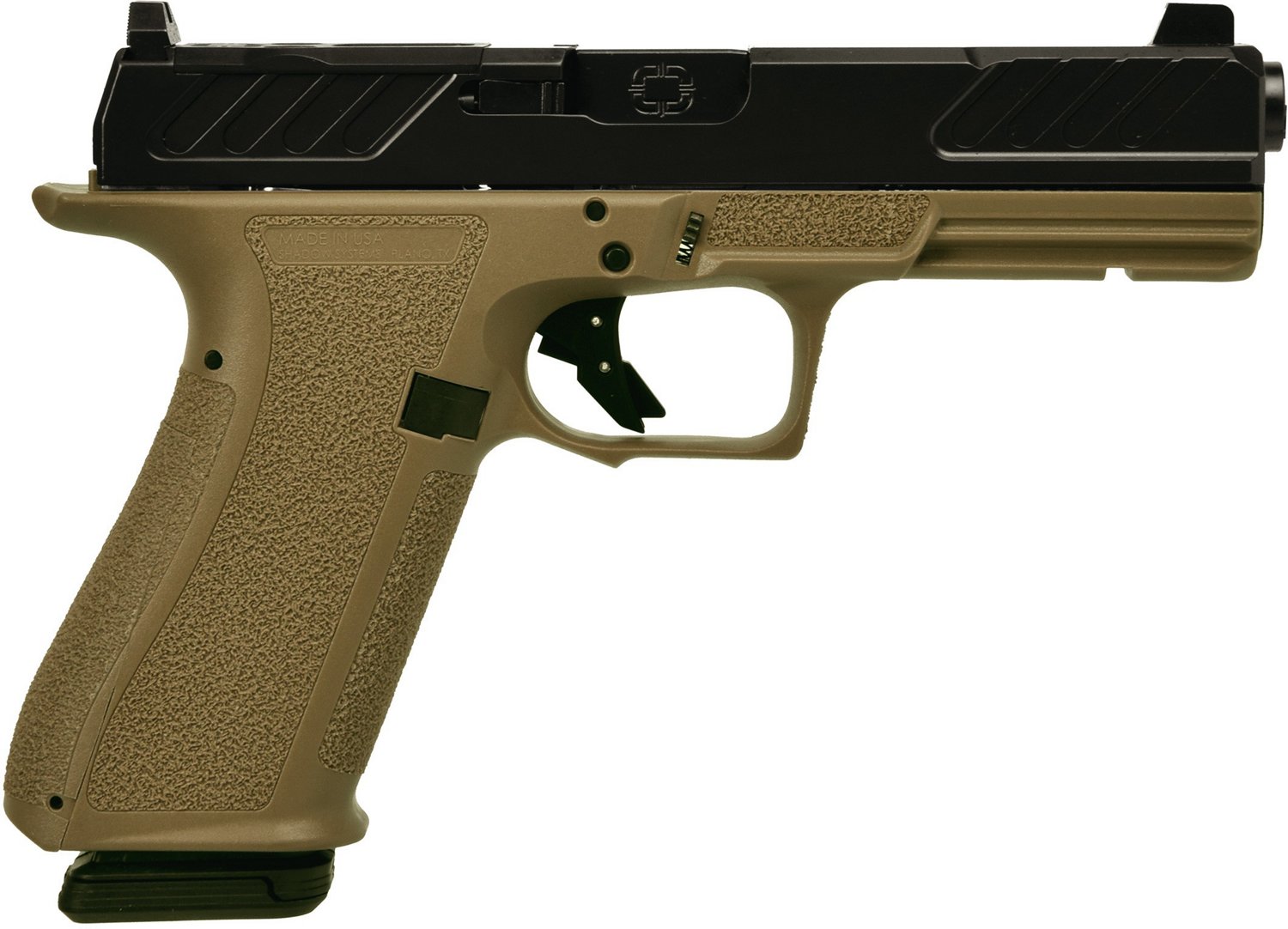 The Shadow Systems MR920 Foundation FDE 9MM Pistol is a striker-fired handgun with a black nitride finish and a polymer frame. It has a 4-inch barrel with a 1 in 10 rate of twist, and fixed sights with a white dot front and a serrated black rear. The pistol is optic ready, with a cut on the slide and a polymer guide rod / optic plate. The pistol has no manual safety, and features a flat face polymer trigger for a crisp and consistent pull.