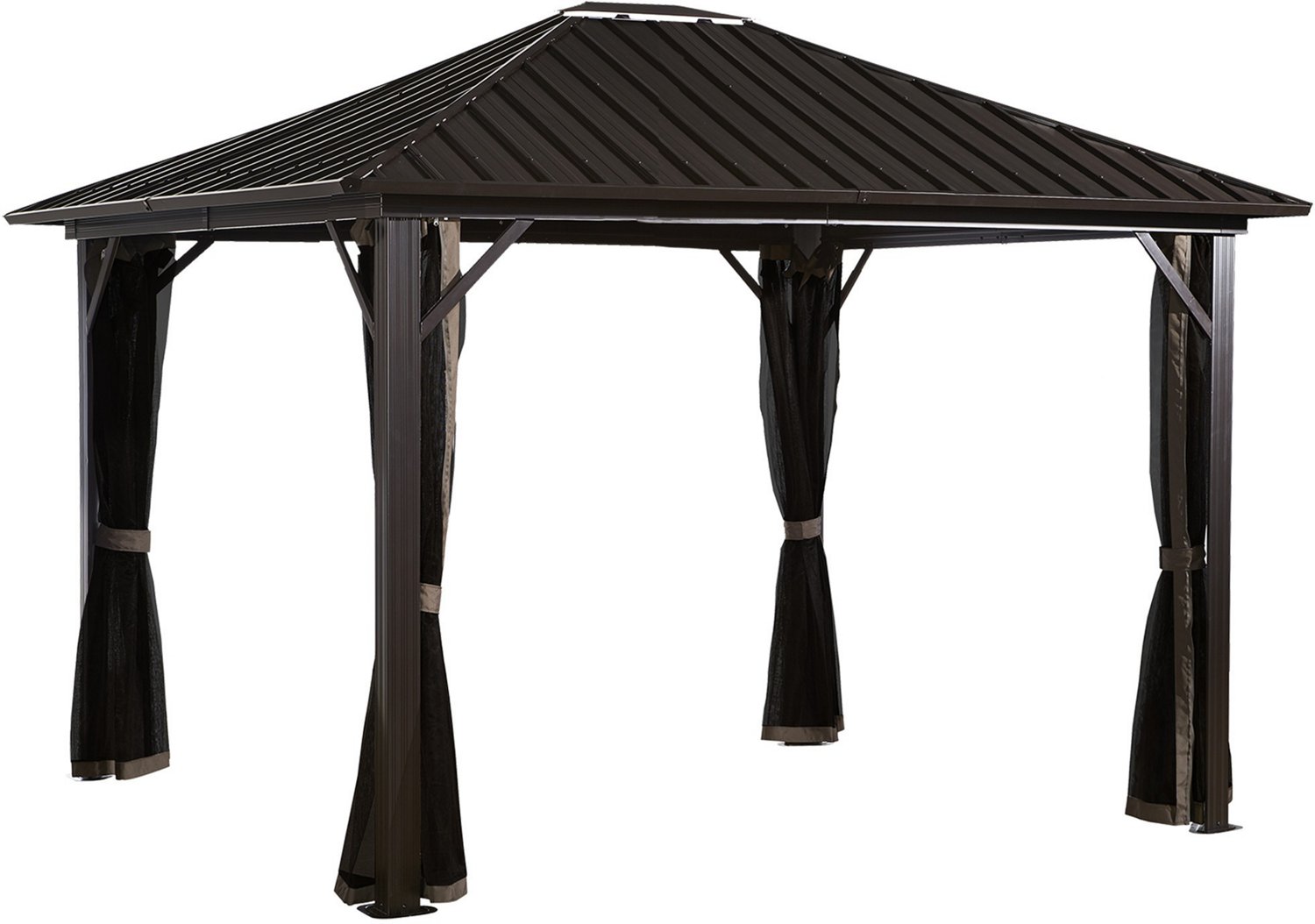 Create a relaxing atmosphere in your backyard when you install the ShelterLogic Genova Hardtop 12 ft x 12 ft Gazebo. The powder-coat aluminum frame with a 2-track system boasts durability, and the galvanized steel roof offers reliable coverage from the elements. The nylon mosquito netting provides lasting protection from pests, sun and wind exposure.