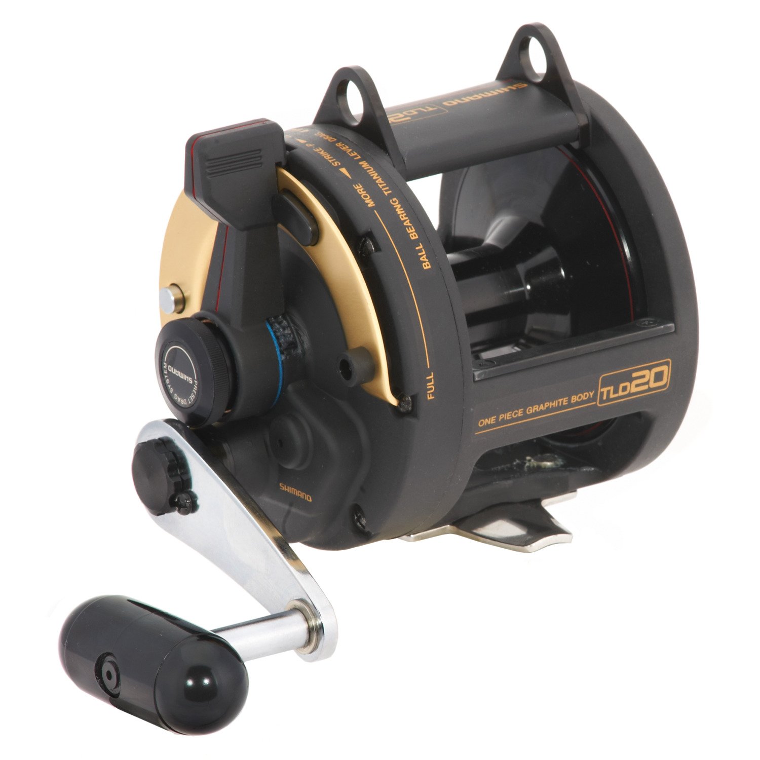 Reel in the fish with the Shimano TLD20 Lever Drag Reel Right-handed. The reel features a graphite frame for light weight, and 4 antirust ball bearings with titanium drag offer smooth performance. The stainless-steel reel foot securely attaches to a rod, and the reel is great for casting, trolling or live bait fishing. Power handle with a barrel knob. Loud click strike alarm. Approved for use in saltwater. 700 yards/20 pounds, 450 yards/30 pounds, 330 yards/40 pounds. 23.6 ounces.