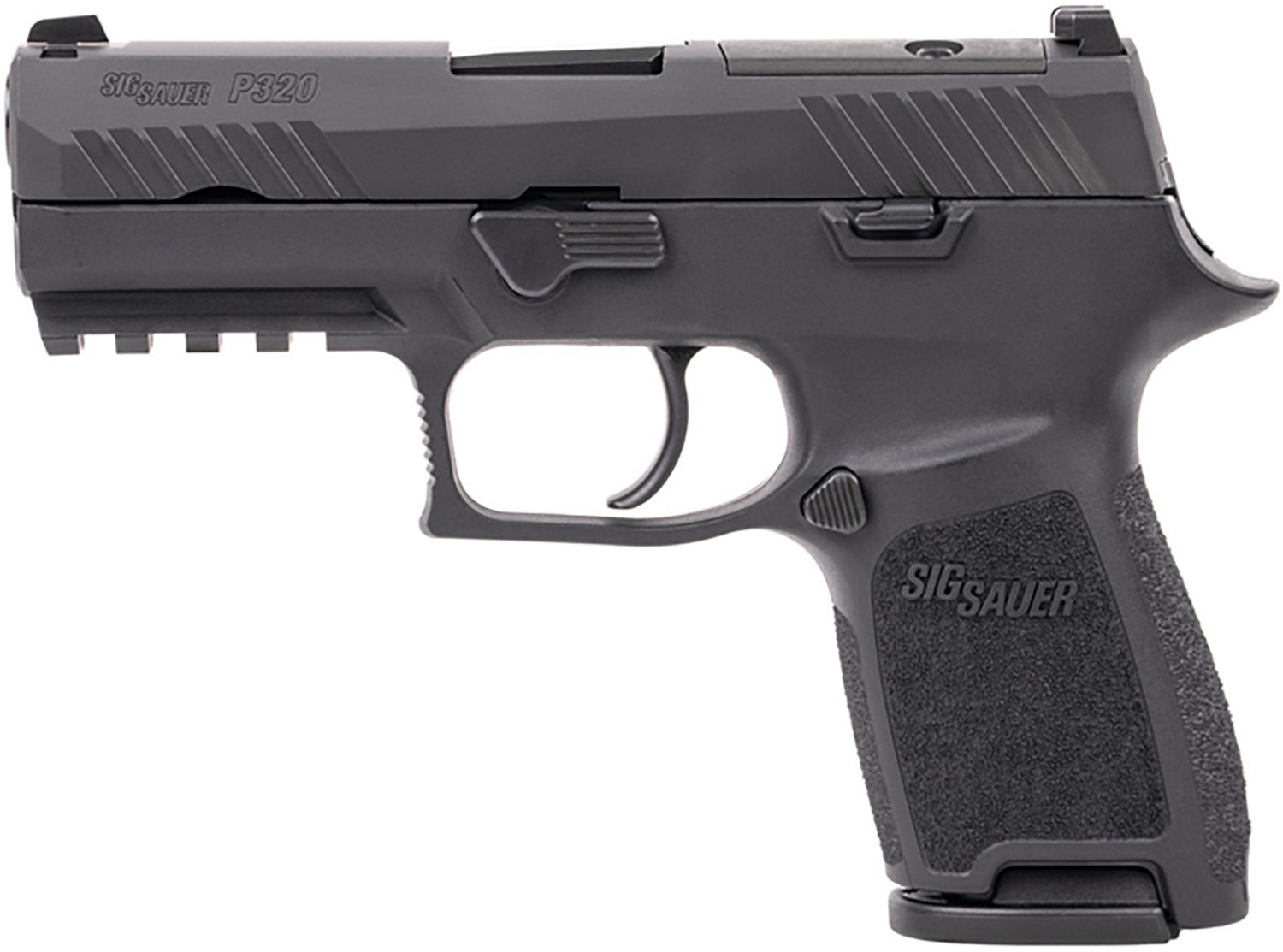 The SIG SAUER P320 9mm 15-Round Striker Fired Pistol has a 15-round capacity and a 3.9-inch carbon steel barrel with DLC coating. This striker-fired pistol also has a curved trigger and a compact medium grip with accessory rail. Weighing 1.66 pounds, this compact firearm features a nitron finish and a PRO optic footprint.