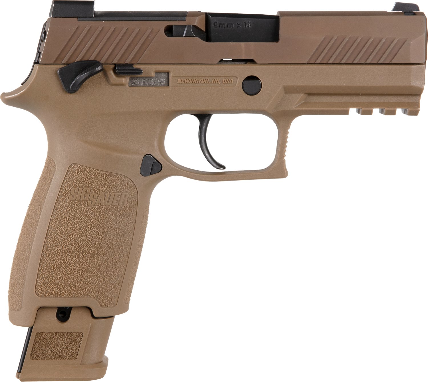 The SIG SAUER P320-M18 9mm Pistol features a SIGLITE front sight and an optic-ready Coyote PVD slide with a removable Night Sight plate. The slide is compatible with the ROMEO1 PRO.