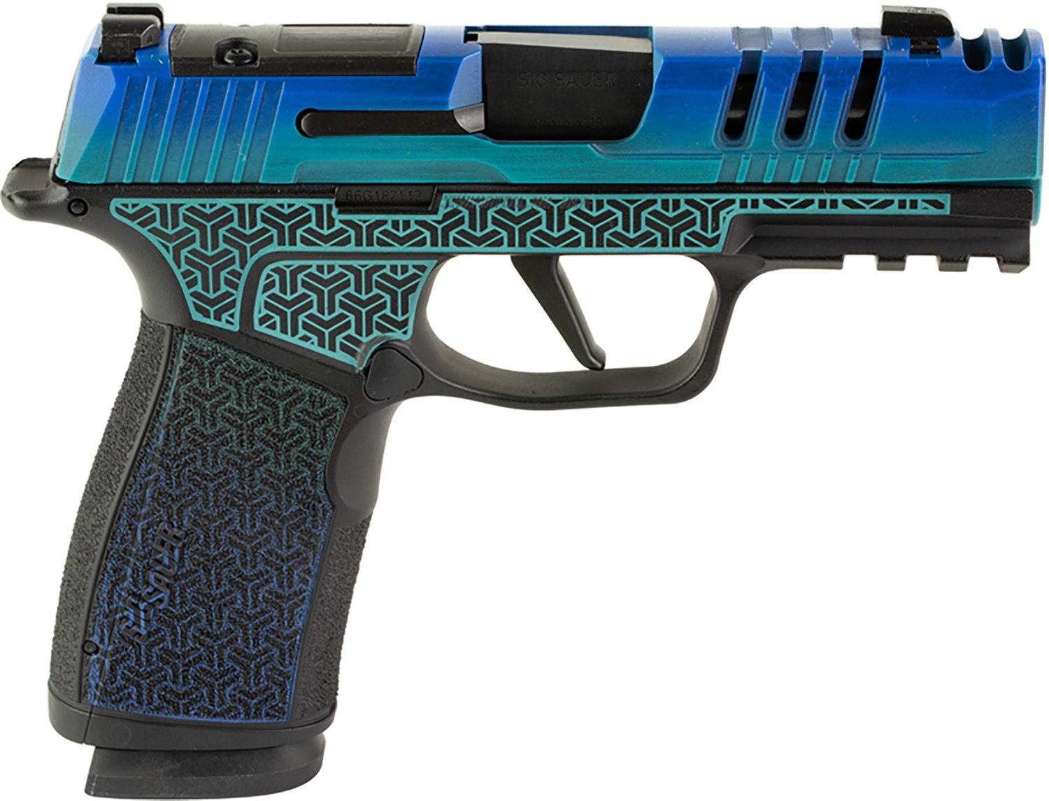 Arm yourself with the SIG SAUER P365 Macro 9mm Pistol. It's semiautomatic striker fired action with a 17 round capacity. The barrel is 3.1 inches long, and it has a polymer frame grip. It has front and rear night sights.
