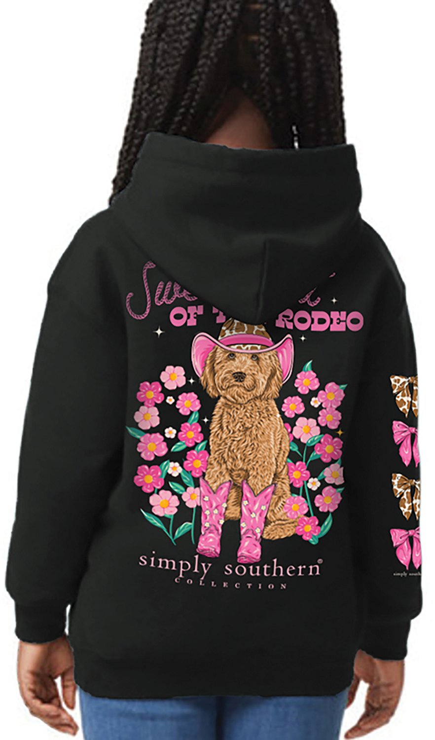 Have your little one looking their best when they wear the Simply Southern Girls' Sweetheart Black Hoodie. It is made of 100% cotton. The long sleeves keep them warm, and its hooded neckline offers additional coverage. The graphic of a dog in cowgirl gear, pink flowers, and "Sweetheart Of The Rodeo" wordmark on the front adds a sweet touch.