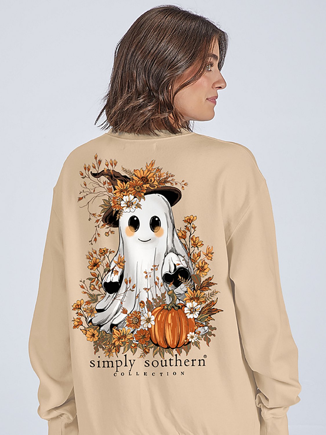 Express yourself in comfort with the Simply Southern Women's Ghost Fleece Crew Sweater. The 100% cotton material is warm and soft, and the cute autumnal ghost print is fun and colorful.