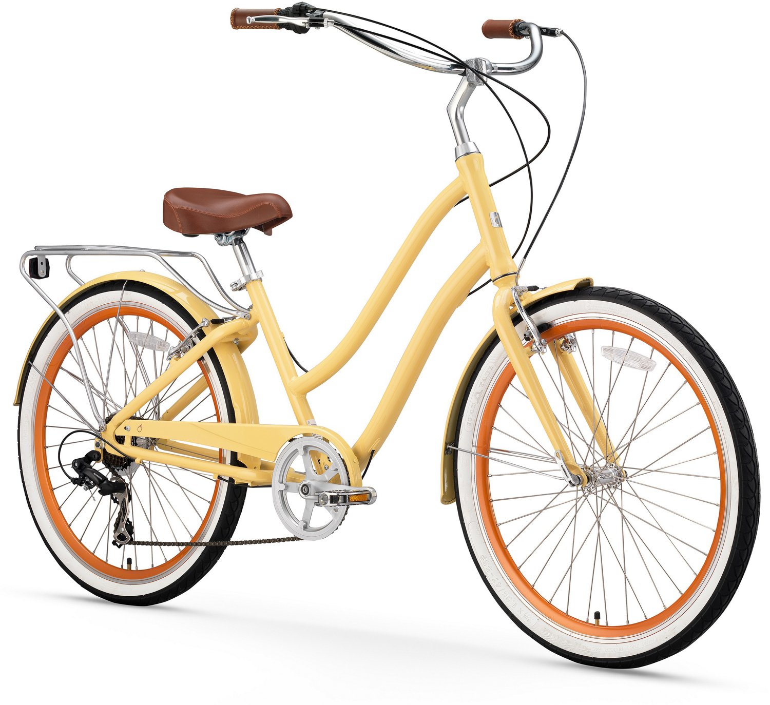 From the beach to the bike path, you can ride in comfort with this sixthreezero Women's EVRYjourney 26 in 7-Speed Touring Hybrid Bike. The 19-inch frame is crafted from lightweight and durable aluminum alloy and provides an upright riding position to alleviate soreness. The 26-inch semi-slick cruiser tires provide reliable traction on a variety of surfaces, and you can quickly change between the 7 available speeds using the Shimano Index shifter to find the one you need.