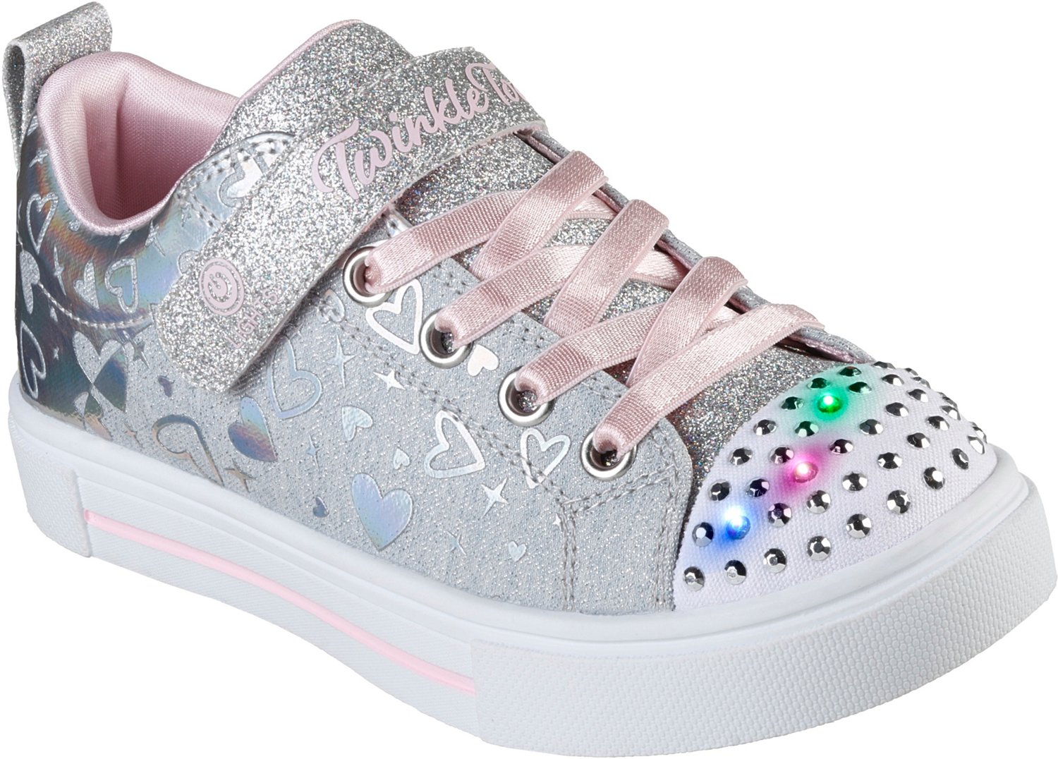 Light up your kids' day with the SKECHERS Girls' Twinkle Sparks Heather Charm Shoes. These shoes feature sparkly synthetic uppers, light-up soles and sparkly heart designs to brighten up her step. Hook-and-loop straps allow for easy on and off for little hands.