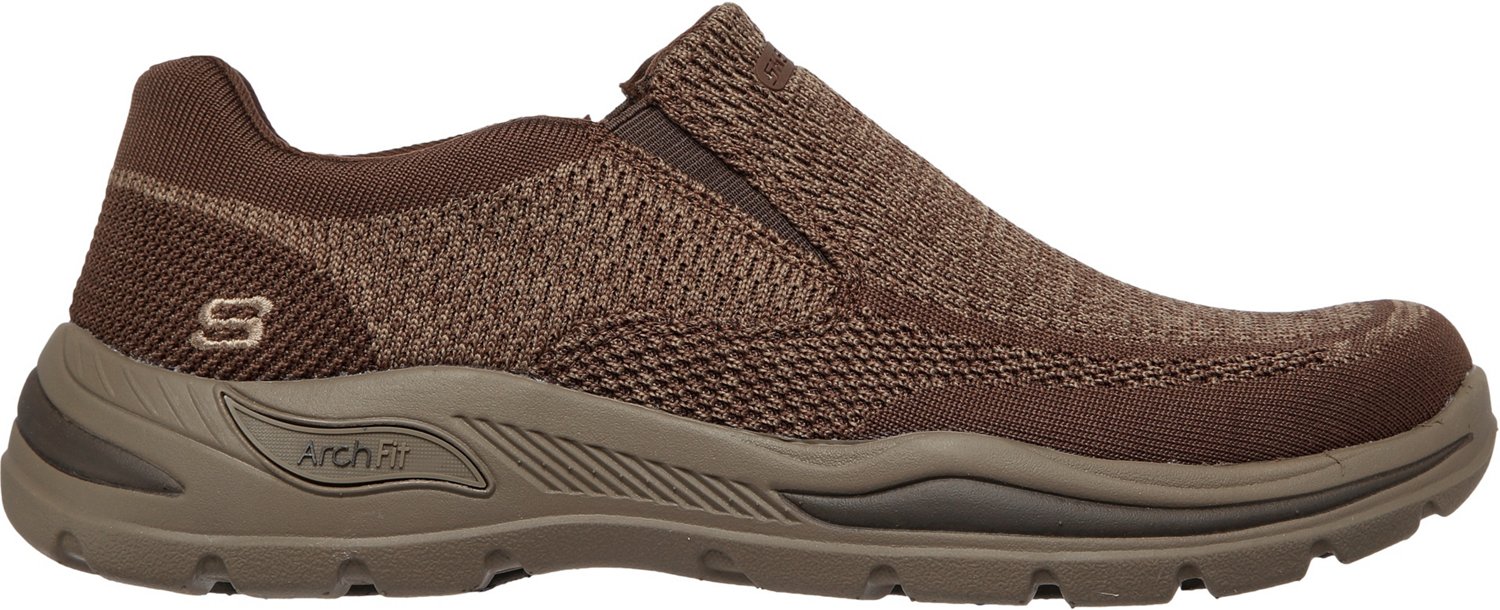 Features and Benefits Soft heather jersey knit uppers provide comfort Cushioned midsoles with speckle color details Flexible rubber traction outsoles Slip-on design BOBS® from Skechers logo detail Decorative laces Moc toes Specifications Closure: Slip-On Product Type: Shoes Footwear - Foot Mechanics: Arch Fit Age Group: Adults' Style: Athletic Shoes & Sneakers Shock absorption: Cushioned midsoles Activity: Casual Material: Knit jersey Gender: Men's Shoe Height: Low Top What's in the Box SKECHERS Men's Arch Fit Motley Vaseo Shoes