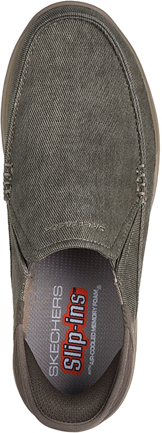 Protect your feet in style with the SKECHERS Men's Slip-Ins Relaxed Fit Expected Shoes. Its canvas and synthetic upper enhances durability. The insole has cushioned comfort Air-Cooled Memory Foam®, and its Hands Free Slip-ins® heel panel offer an easy fit. The Relaxed Fit® design offers a roomy comfortable fit at toe and forefoot.