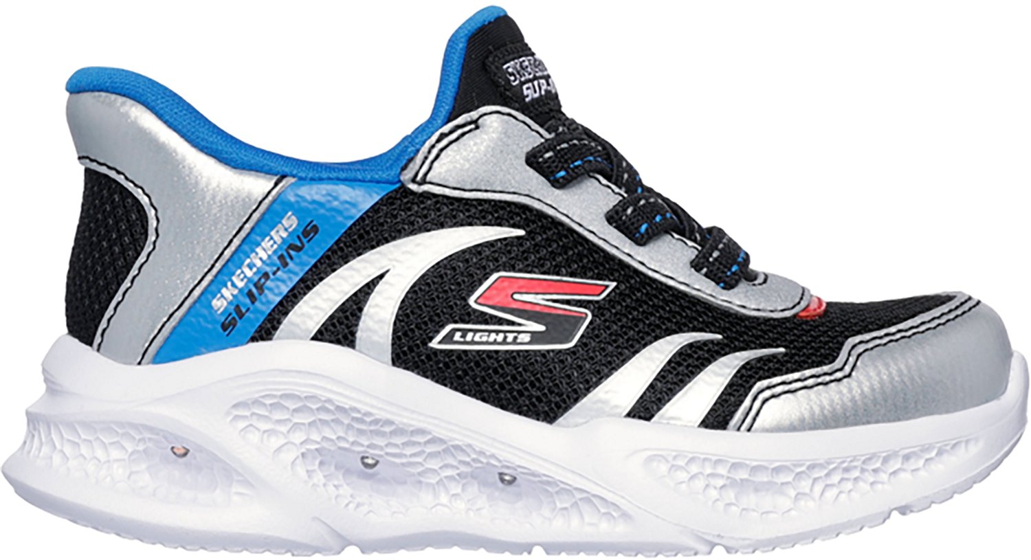Light up every step with the SKECHERS Toddler Boys' Hands Free Slip-Ins S-Lights Meteor Lights Brisk Beams Shoes. The mesh and synthetic uppers promote breathability, while the Air-Cooled Memory Foam insoles provide a comfortable feel. The shock-absorbing midsoles offer cushioning, and the flexible outsoles ensure traction.