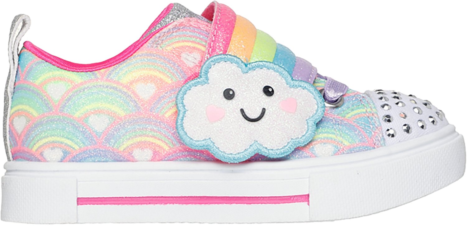 She'll light up the world around her by wearing the SKECHERS Toddler Girl's Twinkle Toes Twinkle Sparks Cloud Cutie Shoes. The synthetic uppers afford durability, while the cushioned insoles and shock-absorbing vulcanized midsoles provide a comfortable feel. The Twinkle Toes light-up rhinestone-embellished toe caps and rainbow cloud graphics deliver a cute, fun look.