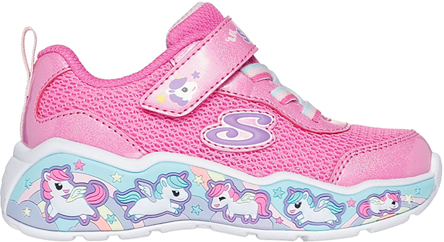 Your little one will play in comfort and style in the SKECHERS Toddlers' Play Scene Fun Squad Shoes. These sneakers have stretchy laces that make them easy for little ones to take on and off. The breathable mesh uppers combine with traction outsoles to help them stay safe, while the cushioned midsoles and insoles cradle their feet for comfortable wear. The glittery details and playful graphics show off their personality.