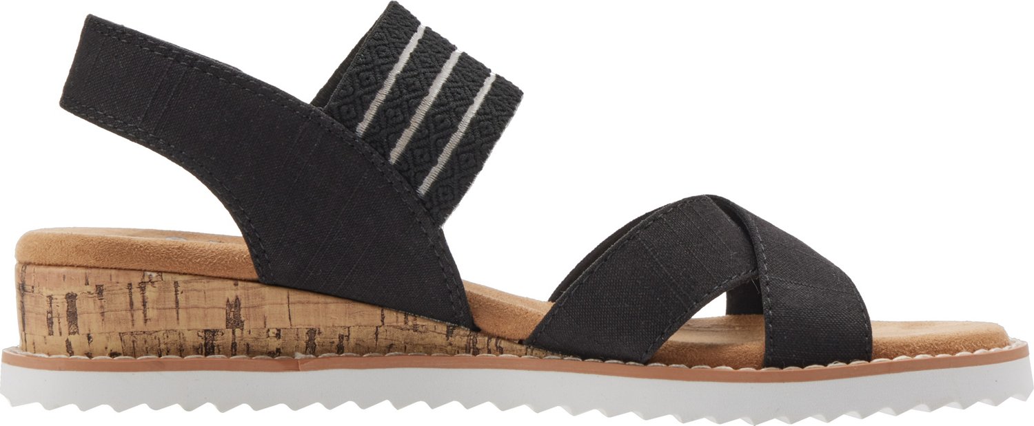 When the weather gets nicer, strap on the SKECHERS Women's Desert Kiss Shore Enough Sandals and take on the day in style. The 100% vegan canvas cross strap uppers have mesh insteps that help circulate air to keep your feet feeling cool, and the SKECHERS Memory Foam™ insoles provide cushioning and support. The espadrille-style low wedge midsoles with cork veneer trims highlight an eye-catching look, and the adjustable sling back strap closure lets you tighten or loosen the fit with ease.