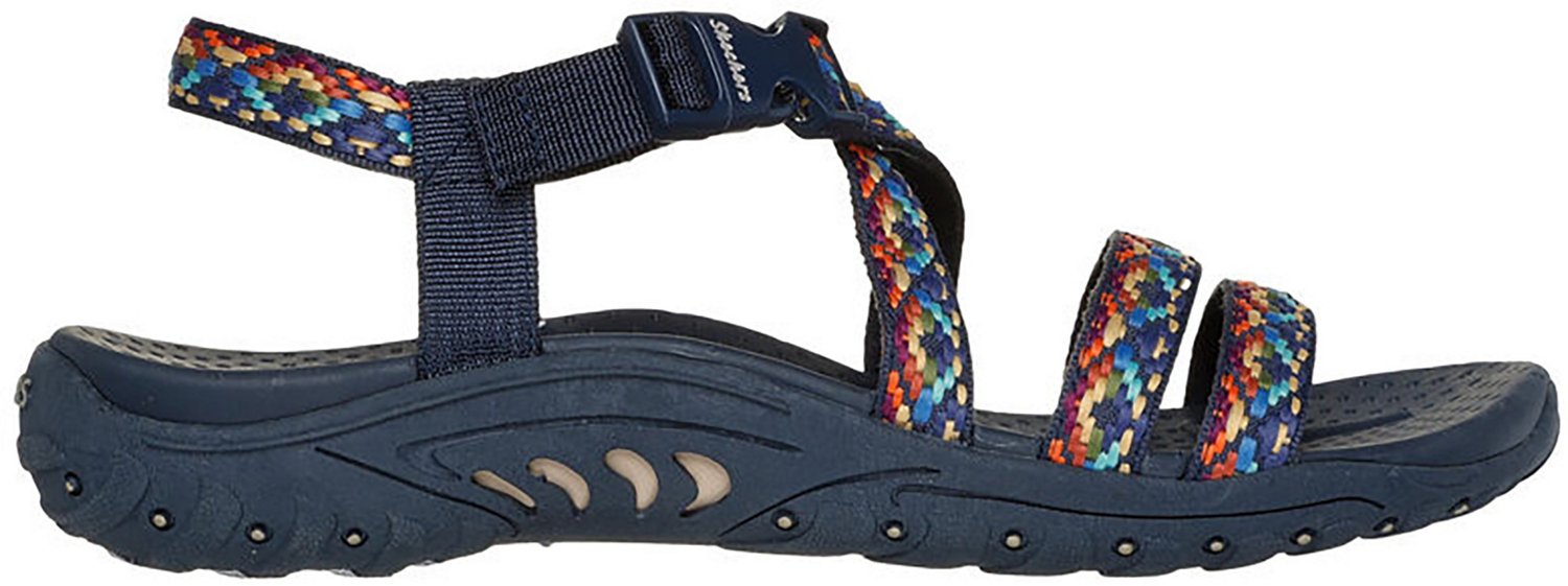 Make sure your feet stay comfortable by wearing the SKECHERS Women's Reggae Wedge Sandals. The woven strap uppers boast durability, while the contoured, cushioned insoles cradle your feet in support. The SKECHERS logo and multicolor details highlight an eye-catching look, and the quick-release button closure provides easier on/off.
