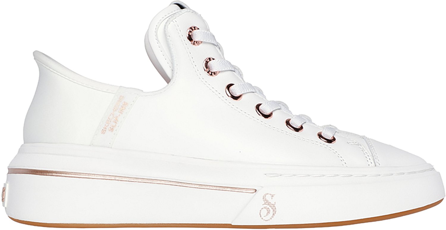 Take your next step in the SKECHERS Women's Snoop One Premium Leather Slip-ins Shoes. Their smooth premium leather upper with stretch laces enhance durability. The Skechers Air-Cooled Memory Foam® insole provides cushioned comfort, and their metallic trimmed midsole with rose gold lace eyelets create an eye-catching design. The flexible traction outsole keeps a good grip.