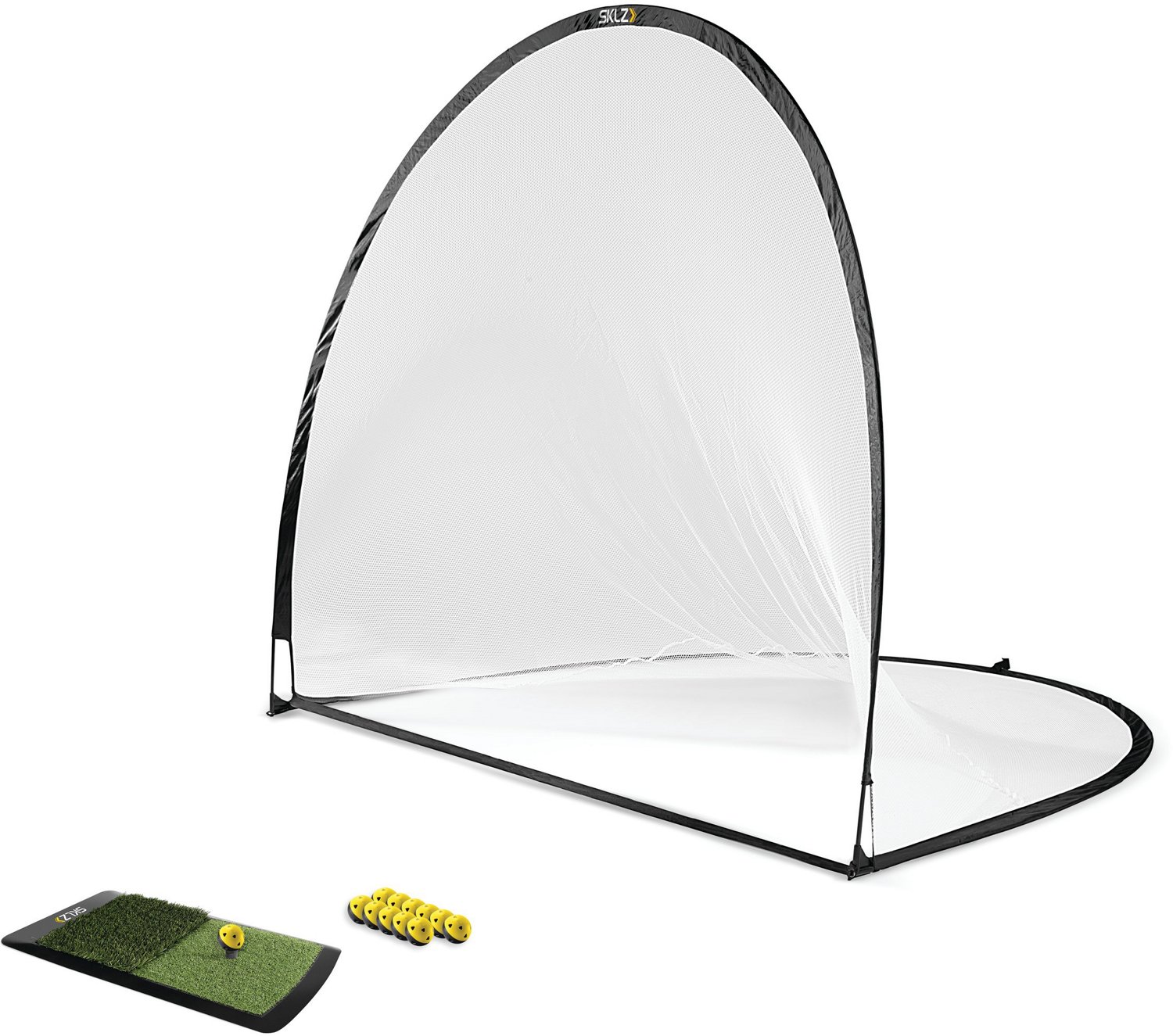 Practice your swing without a trip to the range with the SKLZ Home Driving Range Kit. This home kit is designed to protect your equipment and your home while you practice. The easy-to-set-up 7-foot net catches balls, while the included Impact golf balls only fly a limited distance for safe use in your home. A 2-sided launch pad and rubber tees let you practice hitting on a variety of surfaces.