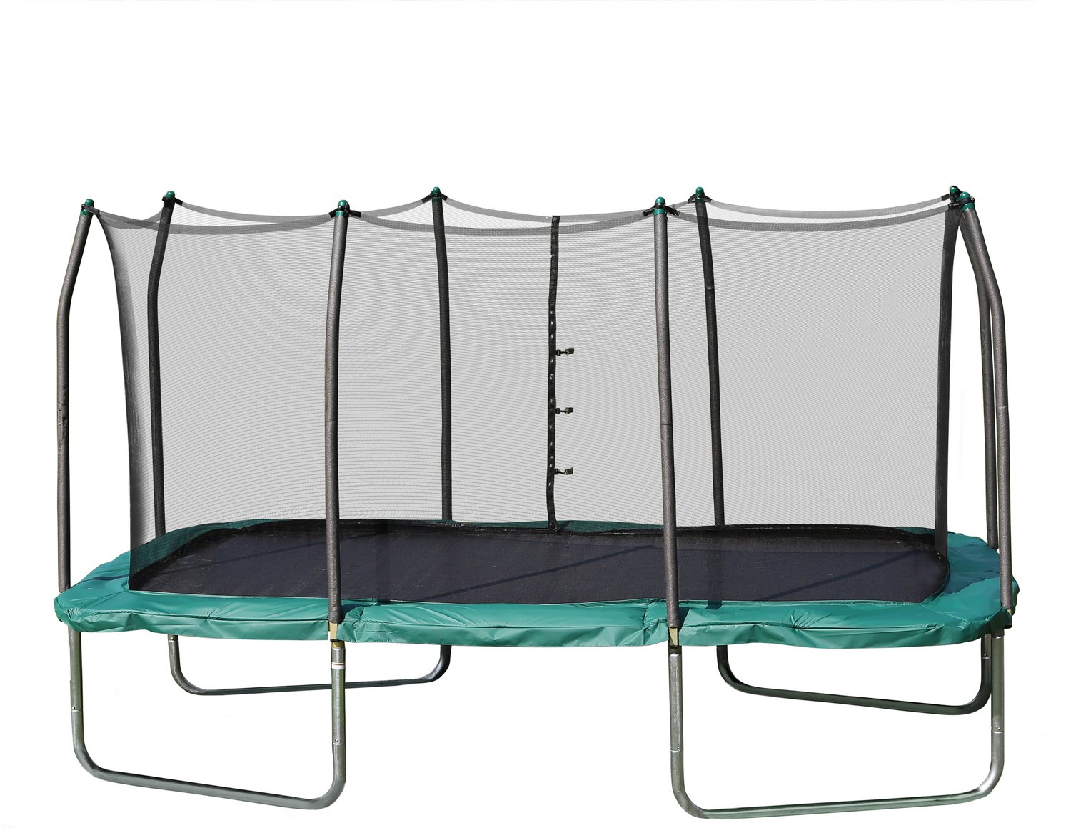 Your kids will love jumping on the Skywalker Trampolines 14' Rectangle Trampoline with Enclosure, which features a 14' x 8' rectangular design with a galvanized steel frame. Welded T-sockets eliminate frame twisting, and the jumping mat is made of heavy-duty, UV protected polypropylene for strength and durability. The enclosure netting provides increased safety, while extra-wide, UV-protected, vinyl safety pads cover the frame and springs. Eighty large, 7" springs and four 5.5" springs provide great bounce.