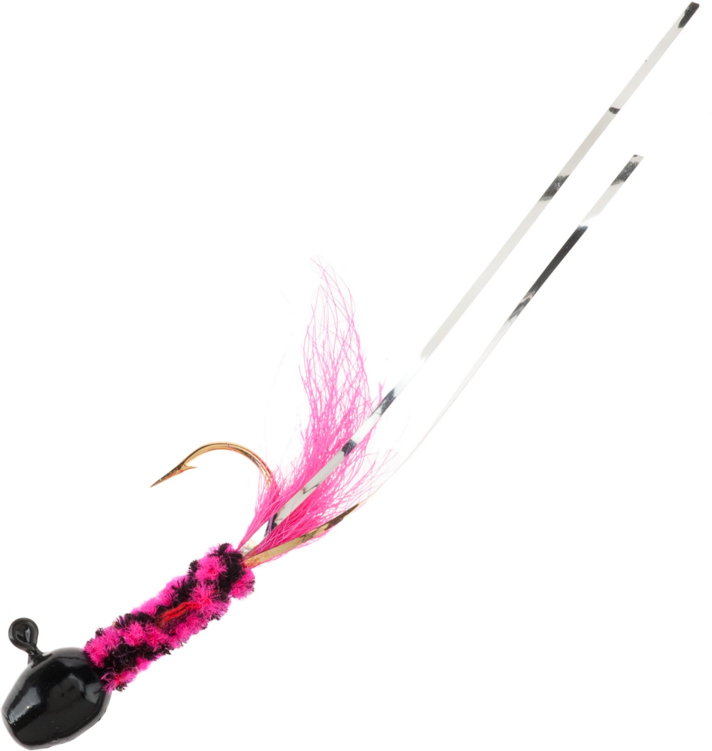 Designed to lure bass to your line, the Slater Original 1/16 oz. Jighead is hand crafted with a painted head, a chenille body, a full kip tail and dual flasher streamers. Size 4 single gold hook.