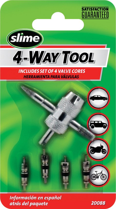 Keep your vehicle's tire and A.C. unit valve cores in top-notch condition with the Slime 4-in-1 Tool and Valve Cores Set. The 4-way valve tool and included valve cores make maintenance quick and easy.
