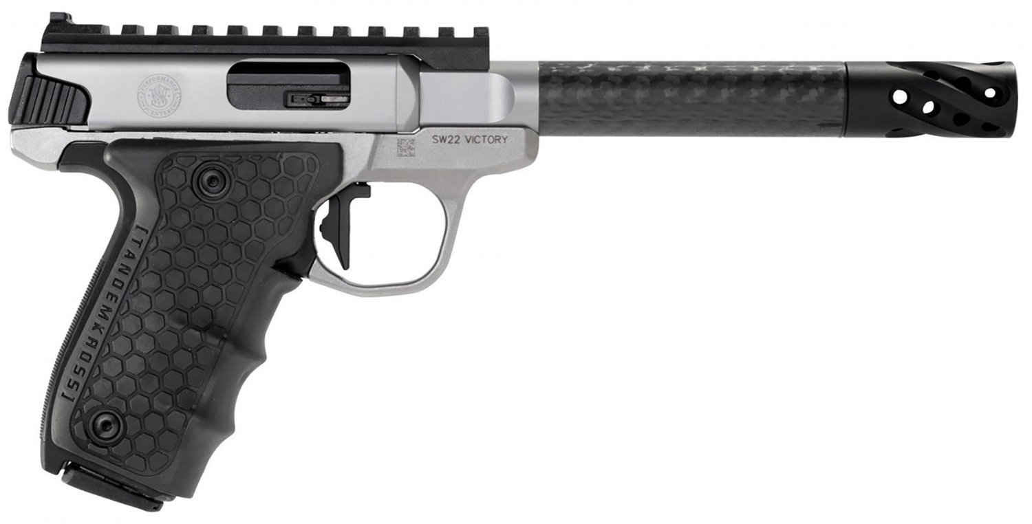 Improve your performance with the Smith & Wesson 12080 Performance Center Victory Target .22 LR Pistol. The stainless steel bolt, barrel and frame afford durability, while the Tandemkross hiveGrips grip and target thumb rest offer comfortable handling.