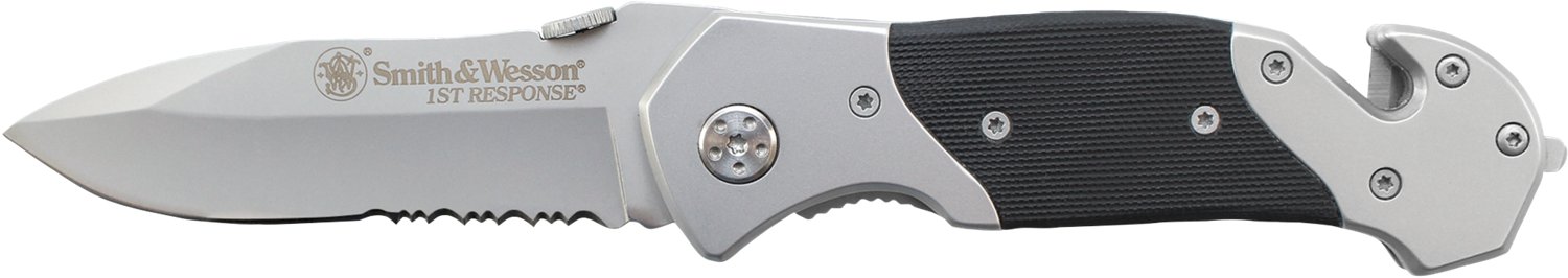 The Smith & Wesson 1st Response Liner Lock Folding Knife features a stainless-steel, partially serrated, drop-point blade and a built-in glass breaker and strap cutter. The stainless-steel handle is designed with a G-10 inlay, and the ambidextrous thumb disc offers simple, quick opening. Pocket clip. 5.92 oz. 3.3" blade length. 8" overall length.