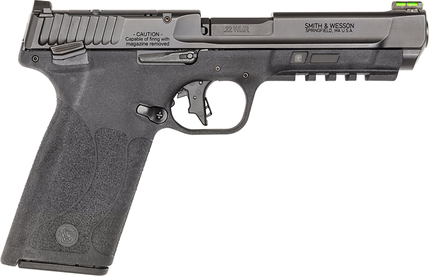 Arm yourself with the Smith & Wesson .22 Magnum Pistol. It is semiautomatic, single and double action with a 10-round capacity. The locked-breech TEMPO barrel is 4.35-inches long, and it is equipped with a polymer grip. The green fiber optic front sight is adjustable.
