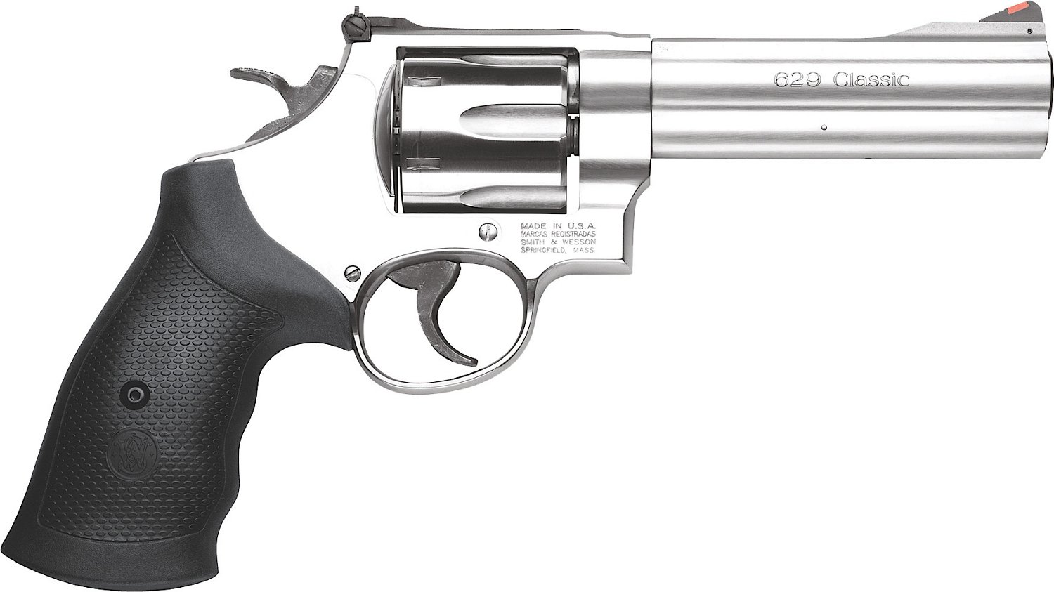 Designed with a large frame, the Smith & Wesson 629 Classic .44 Remington Magnum Revolver features satin-finished, stainless-steel construction, a synthetic grip and an exposed hammer. Ramp front and adjustable rear sights. Accepts both .44 Magnum cartridges and .44 S&W Special rounds (sold separately).