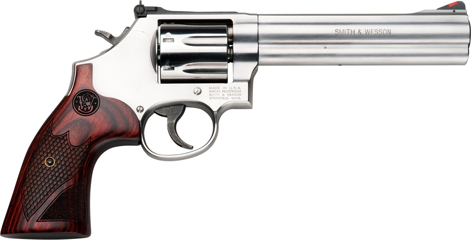 Built for competition and recreational shooting, the Smith & Wesson 686 Plus Deluxe .357 Magnum/.38 S&W Special +P Revolver also works well as a home-defense firearm. This L-frame handgun is made of stainless steel with a 6-inch barrel, a textured wood grip and red ramp front and adjustable white-outline rear sights.