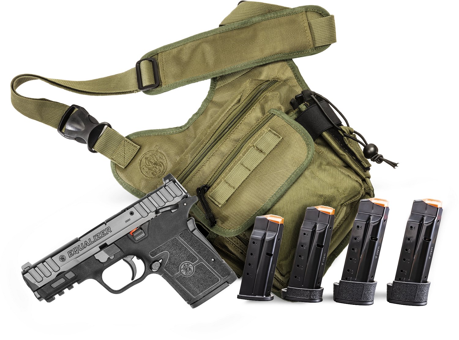 The Smith & Wesson Bug Out 9mm Pistol Bundle has a 3.675-inch barrel with a capacity of 15 rounds and an Armornite finish. This single-action handgun has a grip and manual safety and white dot sights.